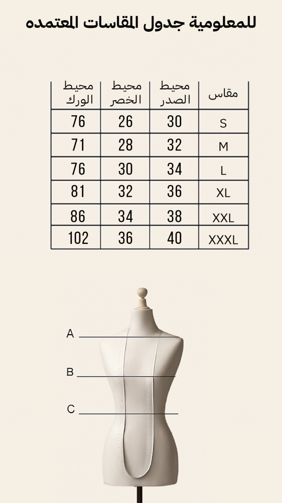 - المقاسات: S, M, L, XL, XXL, 3XL